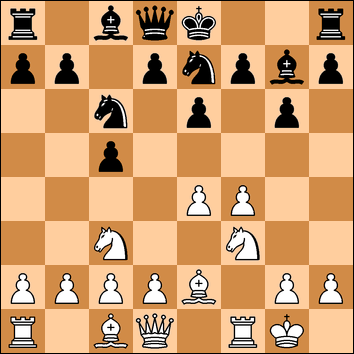 The computer now gives Black a small edge with those well-placed bishops and the tension in the centre. My next move is more or less forced - as opening the centre and the diagonal with 13. exd5 would be a mistake.