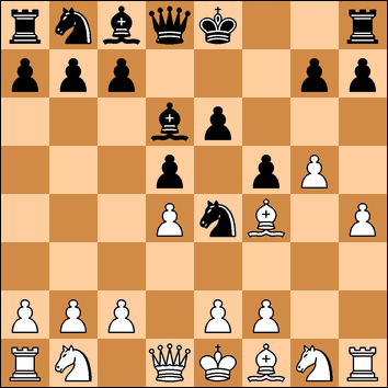 Again castling is better although 11. .. e5 is interesting - perhaps leading to an ending after 12. dxe5 Nxe5 13. Nxe4 fxe4 14. Nxe5 Qxe5 15. Qd4 Qxd4 16. exd4 Rf8.